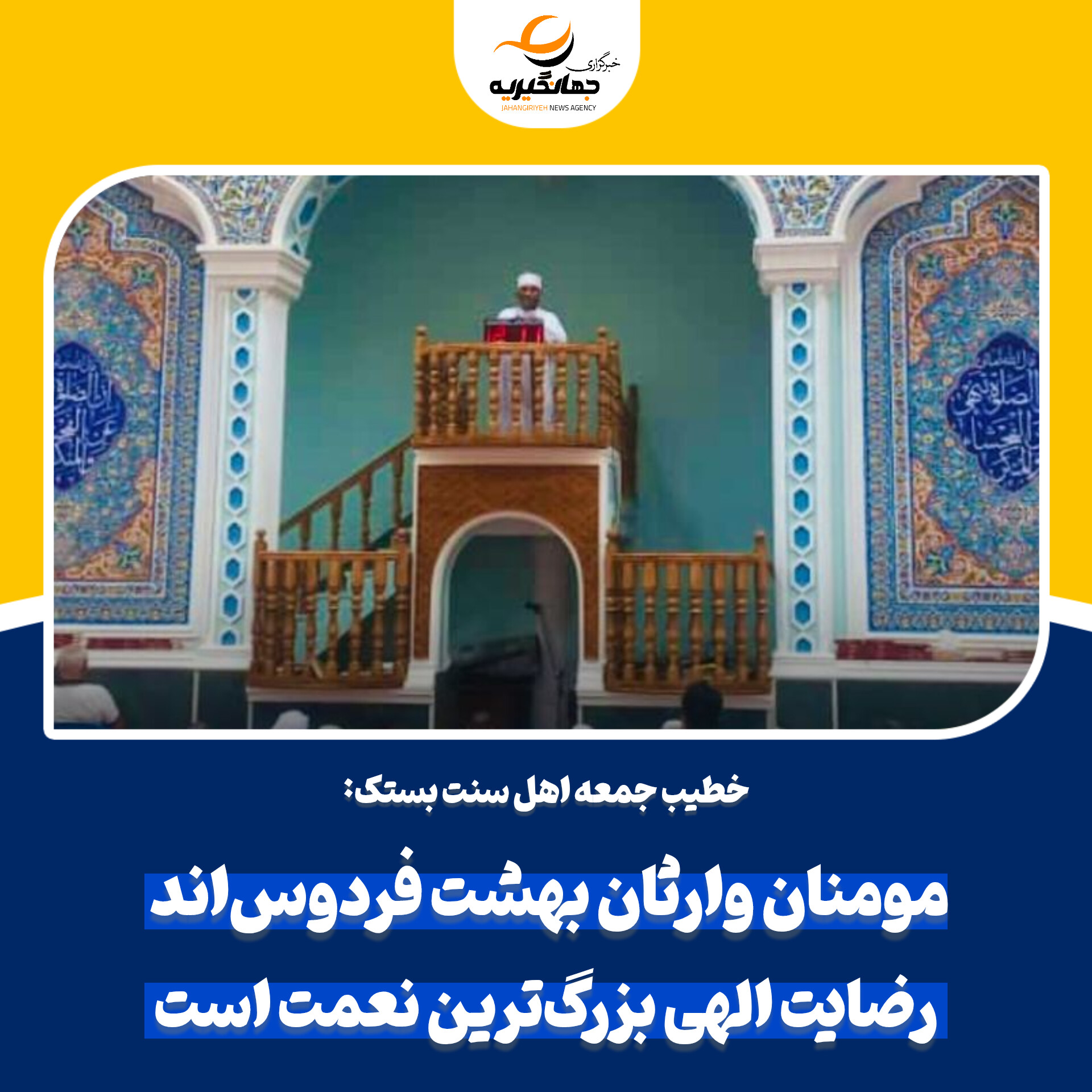 به گزارش پایگاه خبری تحلیلی جهانگیریه، شیخ حسن دستبرسر، خطیب نماز جمعه اهل سنت شهر بستک، در خطبههای این هفته با تبیین ویژگیها و امتیازات مومنان در قرآن کریم، رضایت پروردگار را برترین نعمت و همراهی خداوند با مومنان را والاترین افتخار دانست.