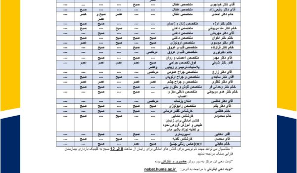 برنامه پزشکان کلینیک بیمارستان فارابی بستک از تاریخ سوم لغایت هشتم خرداد انتهای خبر/
